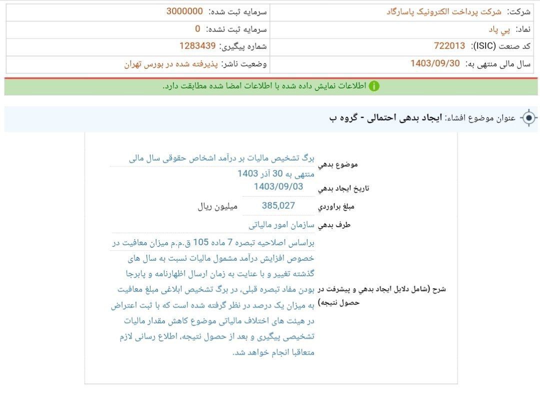 به گزارش شهر بورس، شرکت پرداخت الکترونيک پاسارگاد (پی پاد) با افشای اطلاعات گروه ب در کدال اعلام کرد براساس اصلاحیه تبصره 7 ماده 105 ق.م.م میزان معافیت در خصوص افزایش درآمد مشمول مالیات نسبت به سال های گذشته تغییر و با عنایت به زمان ارسال اظهارنامه و پابرجا بودن مفاد تبصره قبلی، در برگ تشخیص ابلاغی مبلغ معافیت به میزان یک درصد در نظر گرفته شده است که با ثبت اعتراض در هیئت های اختلاف مالیاتی موضوع کاهش مقدار مالیات تشخیصی پیگیری و بعد از حصول نتیجه، اطلاع رسانی لازم متعاقبا انجام خواهد شد.