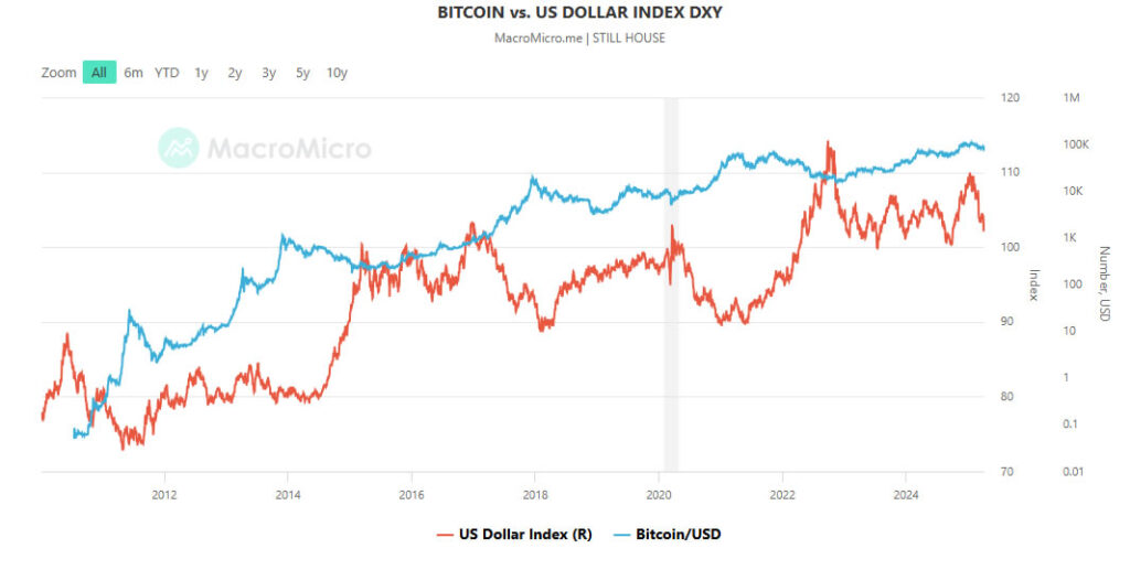 بر اساس داده‌های تریدینگ‌ویو، شاخص DXY از ابتدای سال ۲۰۲۵ تاکنون بیش از ۷٪ کاهش یافته و همزمان، قیمت بیت کوین نیز رشد چشمگیری را تجربه کرده است.