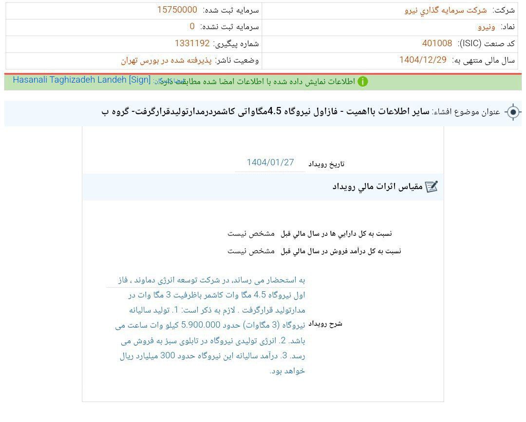 به گزارش شهر بورس، شرکت سرمايه گذاری نيرو (ونیرو) با افشای اطلاعات گروه ب در کدال اعلام کرد به استحضار می رساند، در شرکت توسعه انرژی دماوند ، فاز اول نیروگاه 4.5 مگا وات کاشمر باظرفیت 3 مگا وات در مدارتولید قرارگرفت . لازم به ذکر است: 1. تولید سالیانه نیروگاه (3 مگاوات) حدود 5.900.000 کیلو وات ساعت می باشد. 2. انرژی تولیدی نیروگاه در تابلوی سبز به فروش می رسد. 3. درآمد سالیانه این نیروگاه حدود 300 میلیارد ریال خواهد بود.