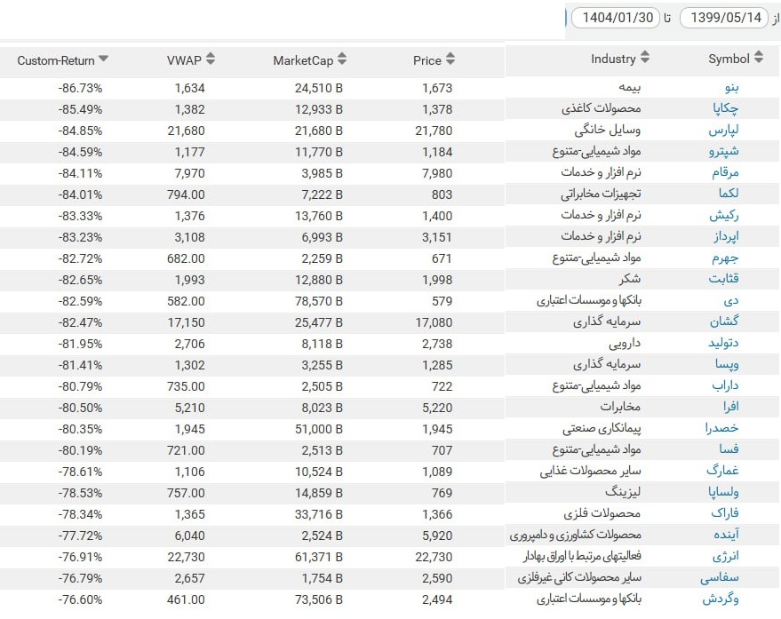 در این میان 25 نماد بورسی و فرابورسی از 18 صنعت که از 14 مرداد 99 تا امروز بین 86 تا 76 درصد ریزش داشته و هنوز به سقف سال 99 نرسیده اند از سوی بورس ویو، معرفی شدند.