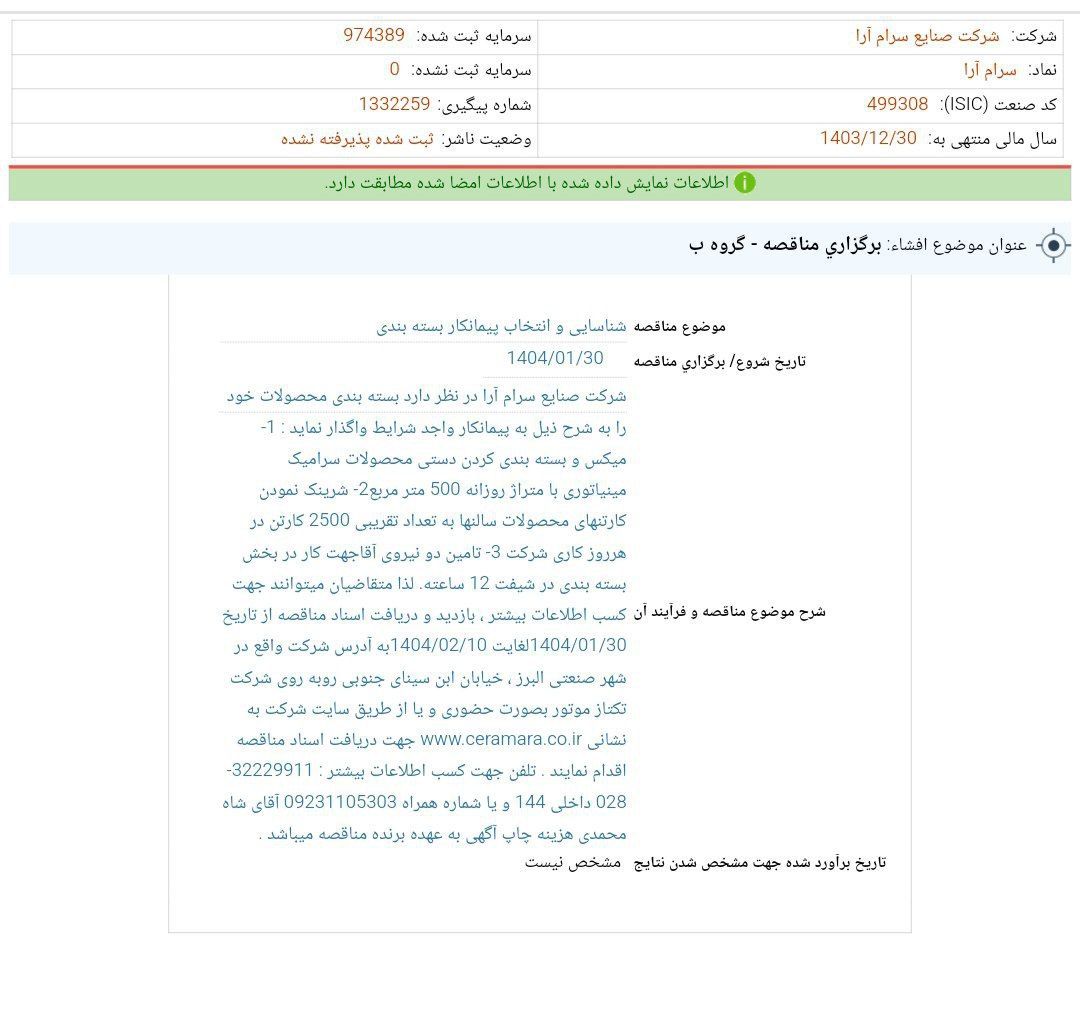 به گزارش شهر بورس، شرکت صنايع سرام آرا (کارام) با افشای اطلاعات گروه ب در کدال اعلام کرد شرکت صنایع سرام آرا در نظر دارد بسته بندی محصولات خود را به شرح ذیل به پیمانکار واجد شرایط واگذار نماید : 1- میکس و بسته بندی کردن دستی محصولات سرامیک مینیاتوری با متراژ روزانه 500 متر مربع2- شرینک نمودن کارتنهای محصولات سالنها به تعداد تقریبی 2500 کارتن در هرروز کاری شرکت 3- تامین دو نیروی آقاجهت کار در بخش بسته بندی در شیفت 12 ساعته. لذا متقاضیان میتوانند جهت کسب اطلاعات بیشتر ، بازدید و دریافت اسناد مناقصه از تاریخ 1404/01/30لغایت 1404/02/10به آدرس شرکت واقع در شهر صنعتی البرز ، خیابان ابن سینای جنوبی روبه روی شرکت تکتاز موتور بصورت حضوری و یا از طریق سایت شرکت به نشانی www.ceramara.co.ir جهت دریافت اسناد مناقصه اقدام نمایند . تلفن جهت کسب اطلاعات بیشتر : 32229911- 028 داخلی 144 و یا شماره همراه 09231105303 آقای شاه محمدی هزینه چاپ آگهی به عهده برنده مناقصه می باشد.
