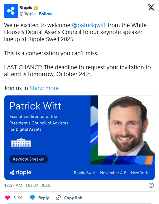همچنین در یکی از نشست‌های مهم با عنوان «تأثیر دارایی‌های مالی توکنیزه‌شده بر بازارهای سرمایه»، مکسول استاین (Maxwell Stein) مدیر دارایی‌های دیجیتال بلک‌راک به همراه مدیران شرکت مودیز (Moody’s) سخنرانی خواهند کرد. از دیگر بخش‌های مهم این رویداد می‌توان به دموی پرداخت‌های استیبل‌کوینی روی شبکه ریپل و سخنرانی‌های برد گارلینگهاوس (Brad Garlinghouse)، مدیرعامل ریپل و آدنا فریدمن (Adena Friedman)، مدیرعامل نزدک، اشاره کرد.
