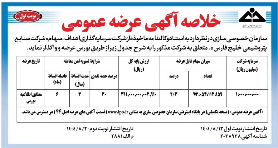 2.3 درصد از سهام هلدینگ پتروشیمی خلیج فارس برای عرضه در بورس از سوی سازمان خصوصی سازی و به وکالت از سرمایه گذاری اهداف، آماده واگذاری شد.