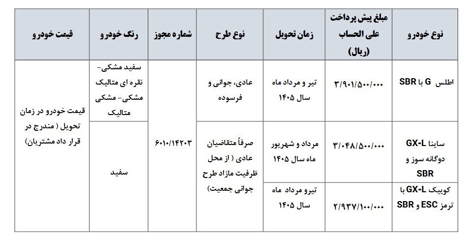 بر اساس این گزارش، مبلغ پیش پرداخت این محصولات در رنگ های سفید، مشکی، نقره ای متالیک و … از 290 تا 390 میلیون تومان با موعد تحویل تیر تا شهریو