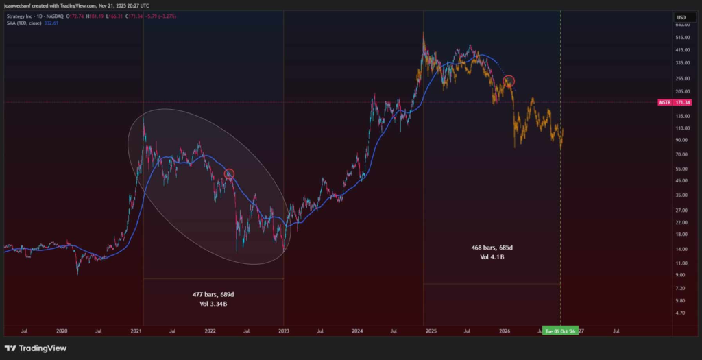 در تحلیلهای اخیر، بار دیگر یک فرکتال آشنا در نمودار MSTR پدیدار شده است؛ الگویی که دقیقاً پیش از سقوط بزرگ سالهای ۲۰۲۱ تا ۲۰۲۲ شکل گرفته بود و حدود ۶۸۹ روز بازار را در مسیر نزولی نگه داشت. آن زمان MSTR وارد یک روند فرسایشی شد و همزمان بیت کوین نیز دستکم یک سال با کاهش قیمت، نوسانات شدید و از دست رفتن شدید نقدینگی مواجه شد.