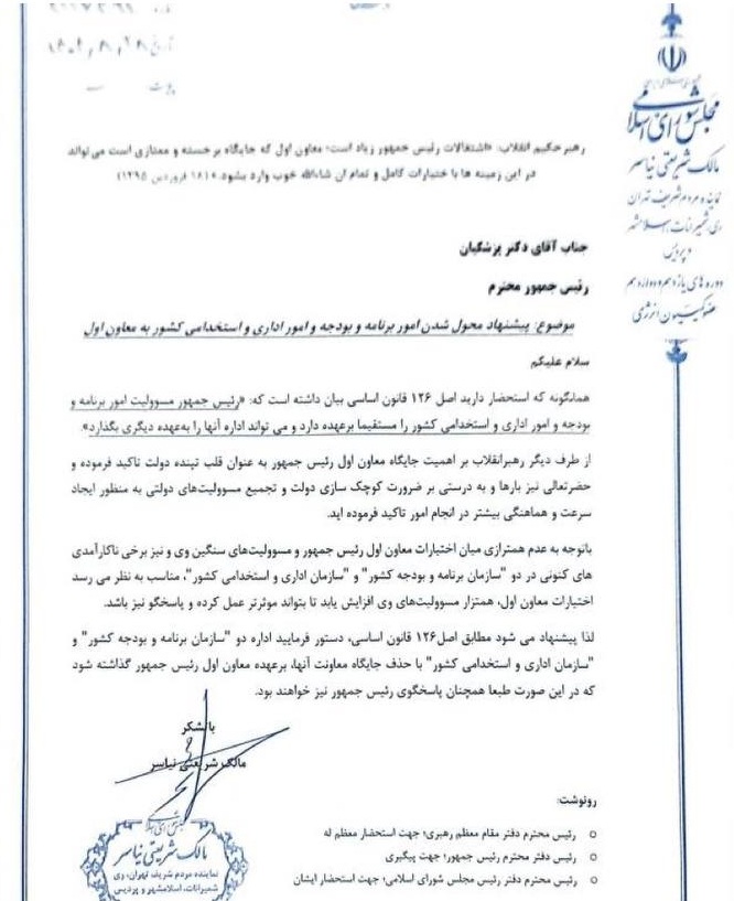 مالک شریعتی در شبکه اجتماعی اعلام کرد: در نامه‌ای به مسعود پزشکیان پیشنهاد شد تا بر اساس مجوز اصل ۱۲ قانون اساسی، اداره دو سازمان برنامه و بودجه و اداری و استخدامی به معاون اول دولت سپرده شود.
