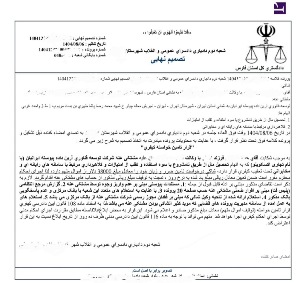 (رسانه میهن بلاکچین صرفاً نقلقولکننده این مدارک است و مسئولیت صحت و تفسیر حقوقی آنها برعهده مراجع قضایی است.)
