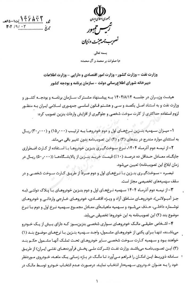 طبق مصوبه جدید هیئت وزیران که توسط معاون اول رئیس جمهور ابلاغ شده از شنبه دو هفته آینده ۱۵ آذر، نرخ بنزین در 3 سطح تعیین می شود. نرخ اول همان ۱۵۰۰ تومان سهمیه ماهانه، نرخ دوم ۳۰۰۰ تومانی و پس از پایان سهمیه اول و نرخ سوم ۵۰۰۰ تومان که با کارت اضطراری جایگاه ها محاسبه خواهد شد. این قیمت برابر با ۱۰ درصد قیمت خرید بنزین از پالایشگاه ها است.