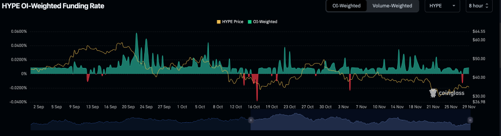 بر اساس دادههای CoinGlass، پس از این انتقال، فاندینگ ریت (Funding Rate) برای HYPE بهطور محسوس به زیر صفر سقوط کرد. پیش از این، فاندینگ از اوایل سپتامبر تا اواسط اکتبر عمدتاً مثبت بود؛ در آن دوره، قیمت HYPE به سمت محدوده ۶۴ دلار حرکت کرد. تغییر جهت فاندینگ ریت در زمانی رخ داد که قیمت کاهش یافته و موقعیتهای فروش (شورت) تقویت شدند.
