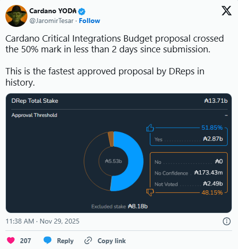 جدیدترین پروپوزال حاکمیتی کاردانو با نام «بودجه ادغامهای کلیدی کاردانو» در حالی که کمتر از دو روز از ثبت آن گذشته بود، از مرز ۵۰٪ رای موافق نمایندگان عبور کرد و تصویب شد؛ اتفاقی که سریعترین فرآیند تایید یک پیشنهاد در کل تاریخ حاکمیت کاردانو به شمار میرود.