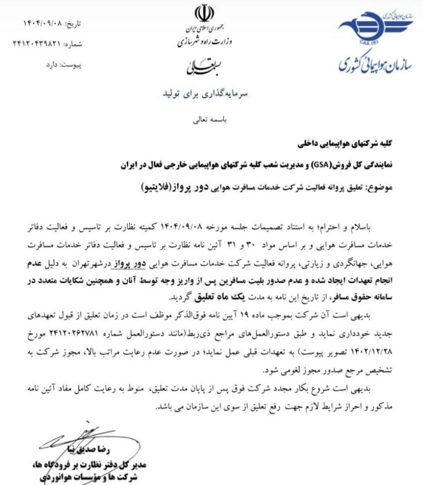 سازمان هواپیمایی، اعلام کرد: فعالیت شرکت خدمات مسافرت هوایی دور پرواز (فلایتیو) به دلیل تخلفات متعدد و شکایات کاربران به مدت یک ماه تعلیق شده است. دلیل این تصمیم، عدم انجام تعهدات مالی به مسافران، دریافت وجوه اضافه از مشتریان، شکایات متعدد و تبلیغات غیرمجاز عنوان شد.