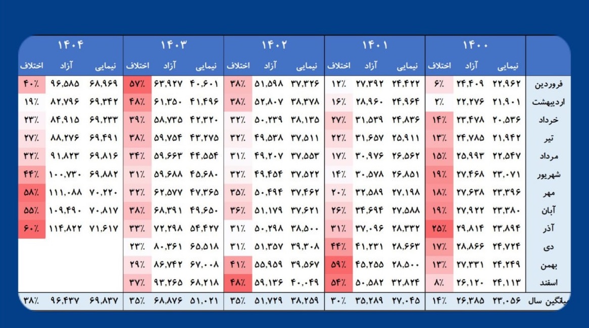بر اساس این گزارش، بررسی روند حکایت از افزایش شکاف نرخ دلار آزاد و نیمایی دارد. به طوری که میانگین سالانه اختلاف نرخ دلار آزاد و نیمایی سال ۱۴۰۰ حدود ۱۴ درصد، سال ۱۴۰۱ حدود ۳۰ درصد، سال ۱۴۰۲ و 1403 ۳۵ درصد، سال 1404 تا کنون 38 درصد بود.