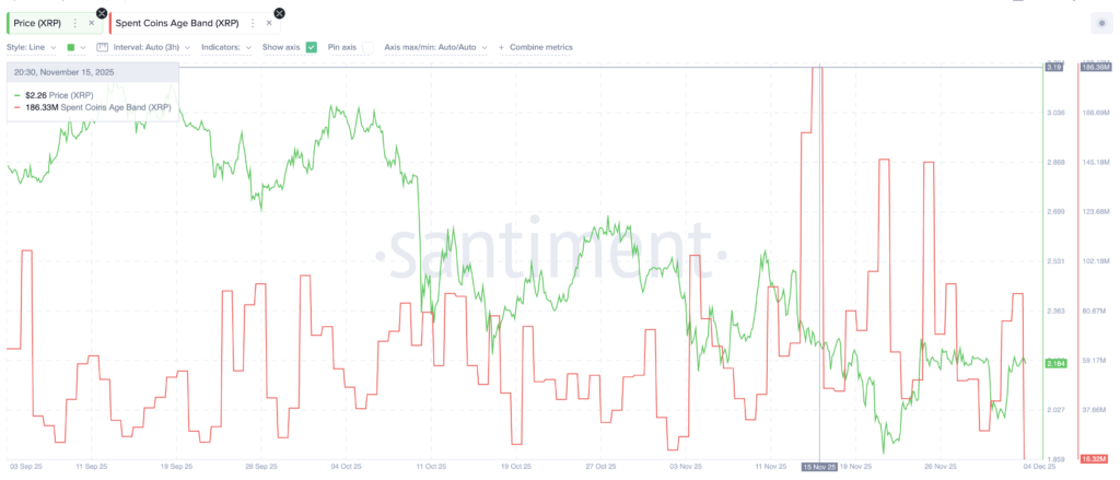 نقطه آغاز این روایت، «کوینهای خرجشده» است؛ معیاری که نشان میدهد چهمقدار از توکنهای قدیمی XRP در یک روز جابهجا میشوند. این شاخص از ۱۵ نوامبر (۲۴ آبان) که روی ۱۸۶.۳۶ میلیون XRP بود، حالا به ۱۶.۳۲ میلیون XRP رسیده است. نزولی ۹۱ درصدی که کمترین مقدار سه ماه گذشته را نشان میدهد.