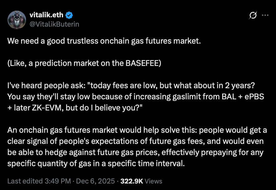 ویتالیک بوترین (Vitalik Buterin) در اظهارنظری جدید بر ضرورت ایجاد یک بازار آتی گس (Gass) کاملاً آنچین و بدون نیاز به اعتماد تأکید کرده است؛ این بازار برای اینکه بتواند آینده کارمزدها را شفاف کند و به کاربران امکان دهد ریسک نوسانهای آتی را پوشش دهند. این موضعگیری در پاسخ به نگرانی بسیاری از کاربران مطرح شده که میپرسند: اگر امروز کارمزدها پایین است، آیا دو سال دیگر هم همینطور خواهد بود؟