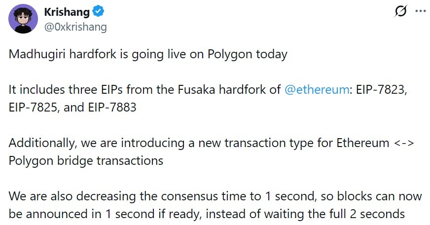 شبکه پالیگان هاردفورک جدیدی به نام مادوگیری (Madhugiri) را فعال کرد. هدف اصلی این ارتقا، افزایش چشمگیر ظرفیت پردازش تراکنشها و رساندن زمان اجماع بلاکها به تنها یک ثانیه است.