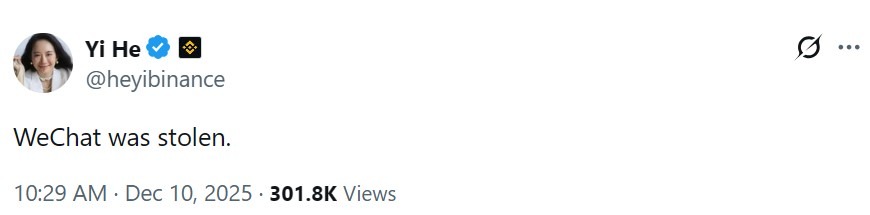 یی هه، همبنیانگذار و مدیرعامل جدید بایننس، اعلام کرد پس از آنکه شماره موبایل سابقش دوباره در بازار مخابراتی چین عرضه شد، حساب قدیمی ویچت او مورد سرقت قرار گرفت.