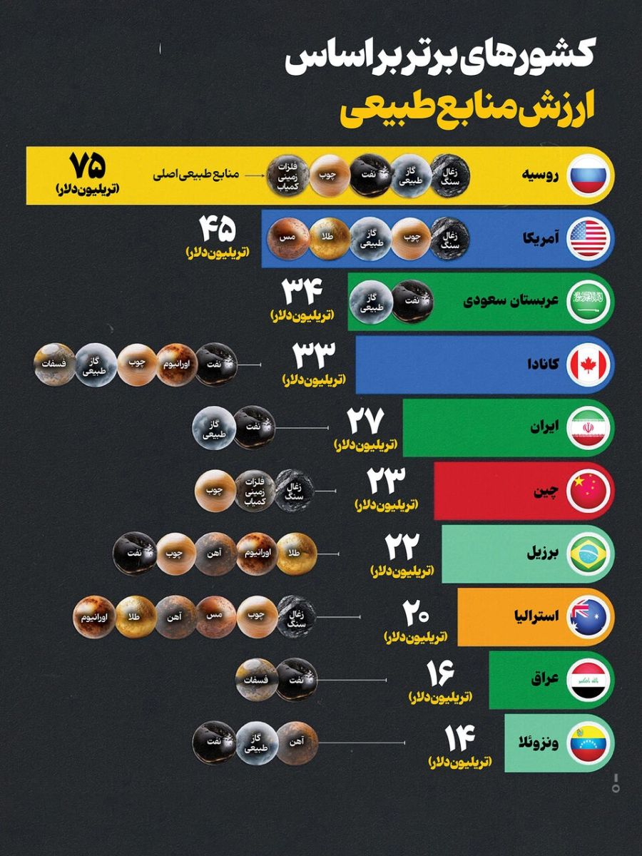 بر اساس این گزارش، روسیه با ۷۵ تریلیون دلار در صدر قرار دارد و ذخایر عظیم نفت، گاز، چوب و فلزات آن را به قدرتی بی بدیل در این حوزه تبدیل کرده است.