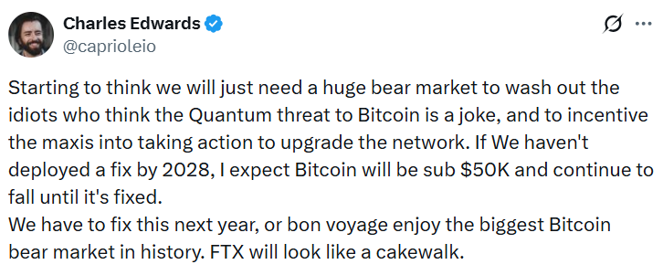 اگرچه بسیاری معتقدند این سناریو هنوز سالها یا حتی دههها با واقعیت فاصله دارد، اما ادواردز دیدگاه متفاوتی دارد. او در پستی که روز چهارشنبه در شبکه اجتماعی ایکس منتشر کرد، پیشبینی کرد که این تهدید میتواند بسیار زودتر از انتظار، حتی تا سال ۲۰۲۸، به یک بحران واقعی تبدیل شود؛ بحرانی که در صورت تعلل صنعت، میتواند قیمت بیت کوین را بهشدت تحت فشار قرار دهد.