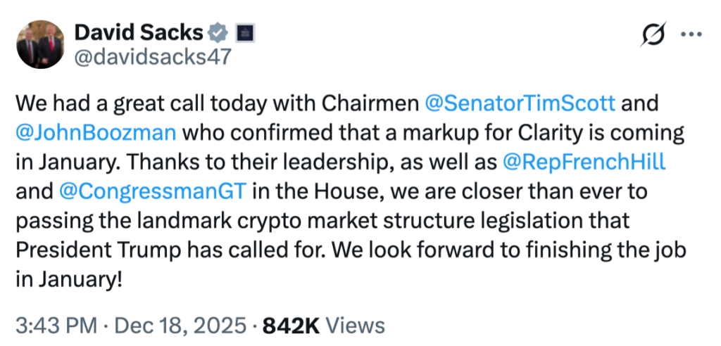اظهارات برنت در شرایطی مطرح میشود که دیوید ساکس (David Sacks)، مسئول حوزه کریپتو و هوش مصنوعی کاخ سفید، بهتازگی اعلام کرده آمریکا بیش از هر زمان دیگری به تصویب قانون کلاریتی نزدیک شده است و احتمالاً این روند در ماه ژانویه نهایی خواهد شد.