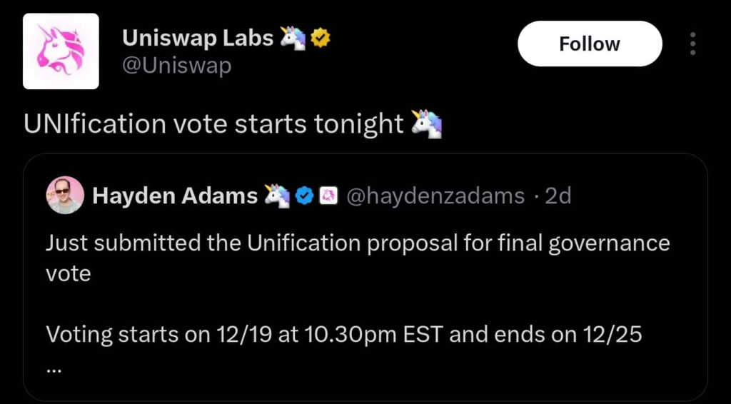 در ۲۴ ساعت گذشته، سه اتفاق مهم نقش پررنگی در جلب توجه بازار به یونیسواپ ایفا کردند. نخستین و مهمترین آنها، رأیگیری پیشنهادی موسوم به یونیفیکیشن پروپوزال (Unification Proposal) است که توسط هایدن آدامز (Hayden Adams)، بنیانگذار یونیسواپ مطرح شده است.
