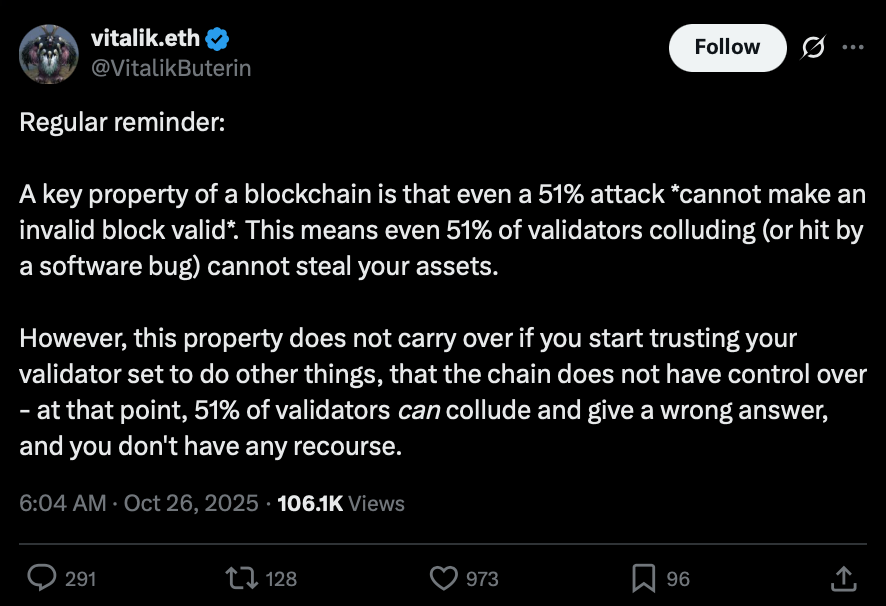 بوترین پستی در شبکه اجتماعی ایکس (X) منتشر کرد و گفت که این خاصیت همان سنگبنای اعتماد در سیستمهای غیرمتمرکز است که امنیت نه از نهاد مرکزی، بلکه از تمرکززدایی میآید.